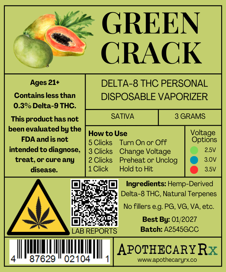 Apothecary Rx 3g Delta-8 Disposable Vaporizer Green Crack