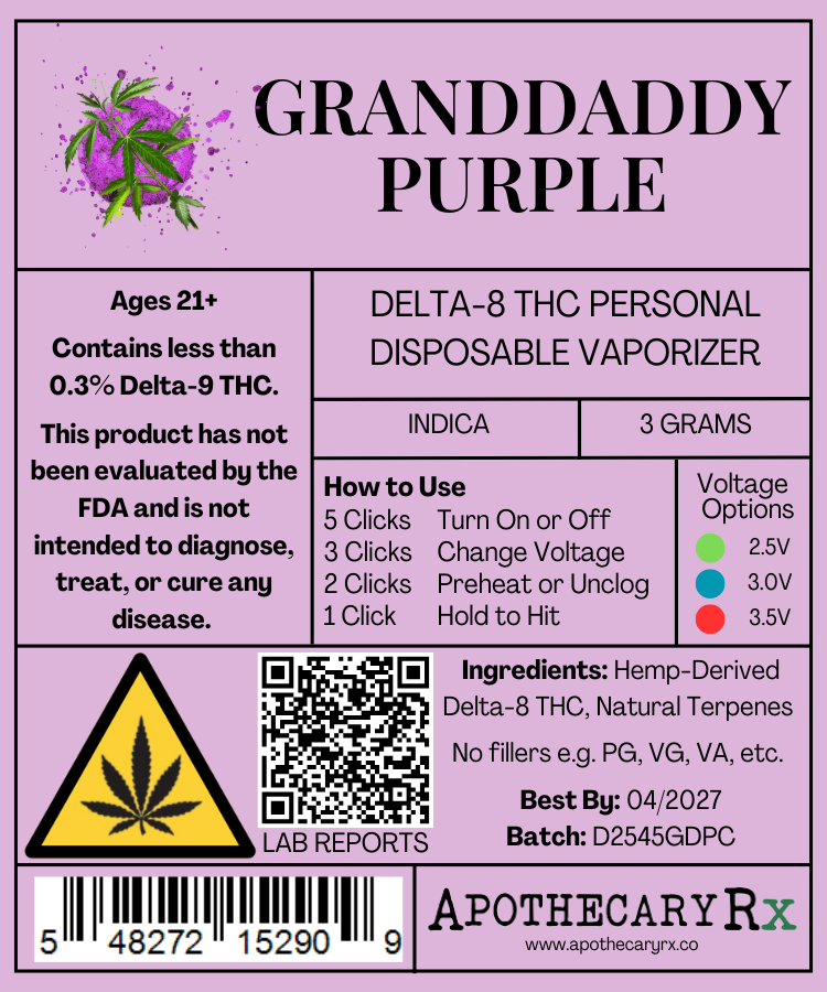 Apothecary Rx 3g Delta-8 Disposable Vaporizer Granddaddy Purple